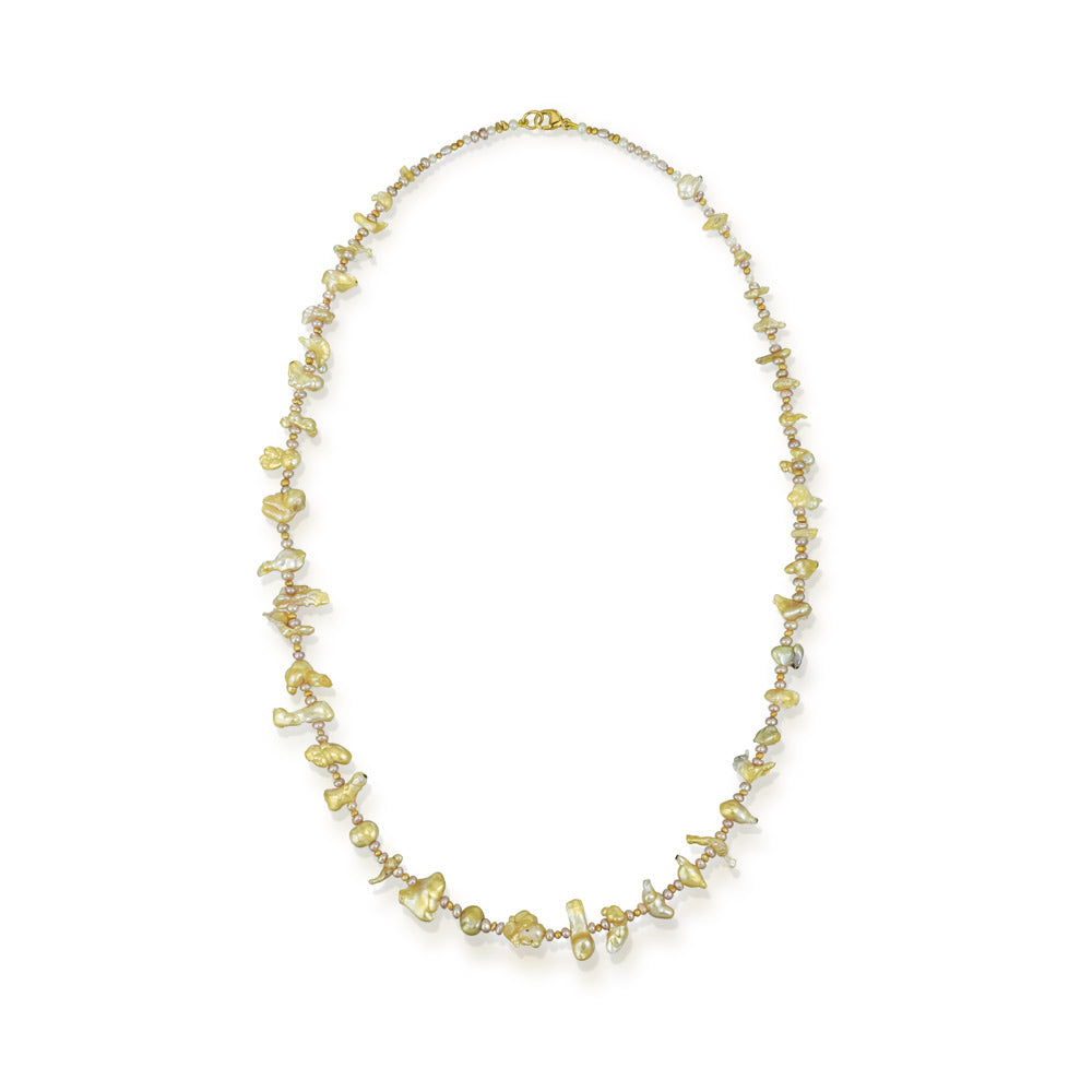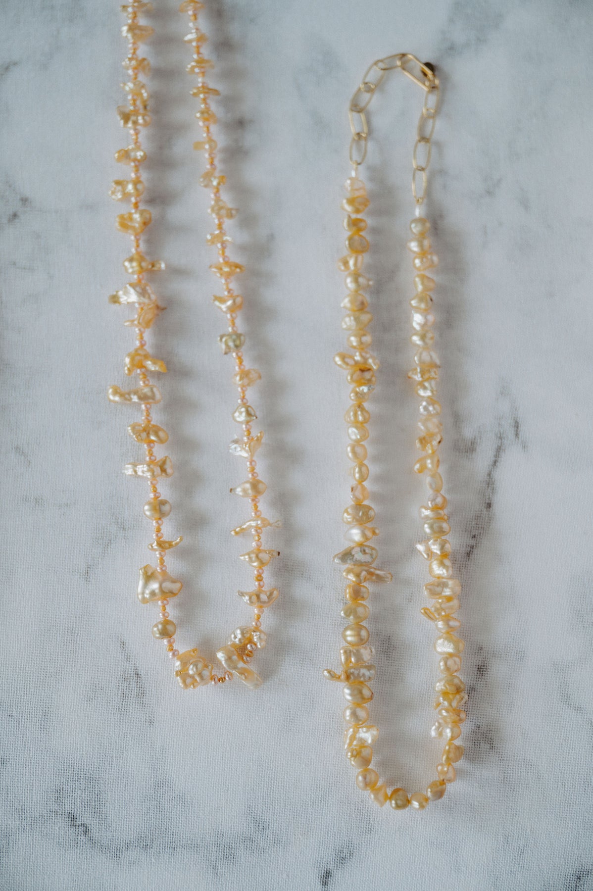 A mixture of white, pink, and gold seed pearls with golden South Sea keshi pearls. This subtle color palette reminds me of hazy sunsets by the beach. Layer it with another one of my seed pearl necklaces or wear it on its own. A one of a kind piece that you'll love to wear!