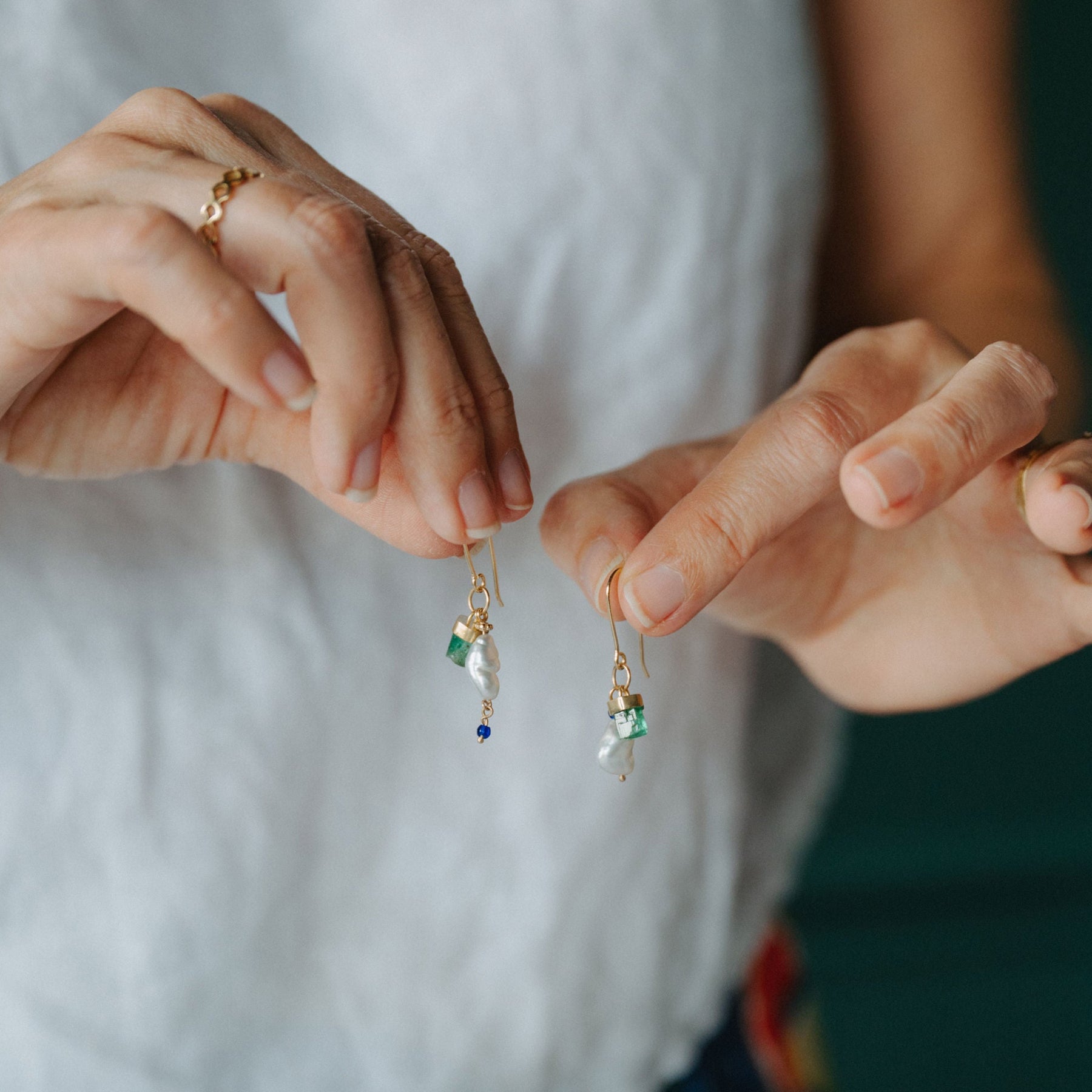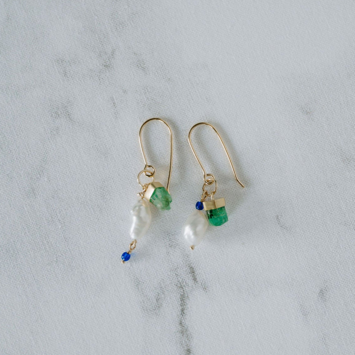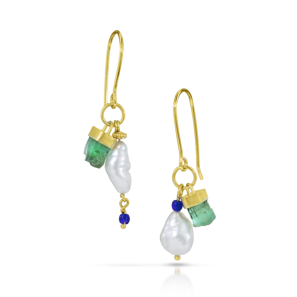I'm incredibly proud of these new earrings! They're bold, fun, and have amazing movement. I particularly love that they're crafted from some of my favorite materials: unpolished, rough emeralds from Ethiopia that I set in 18k gold, white South Sea keshi pearls, and a touch of cobalt glass beads for added flair.