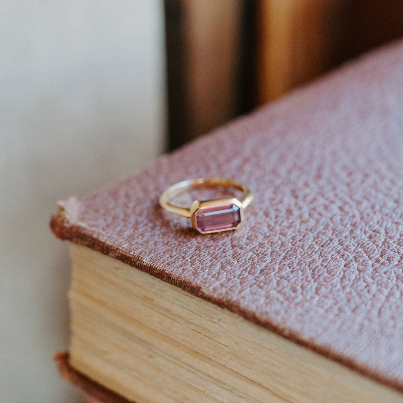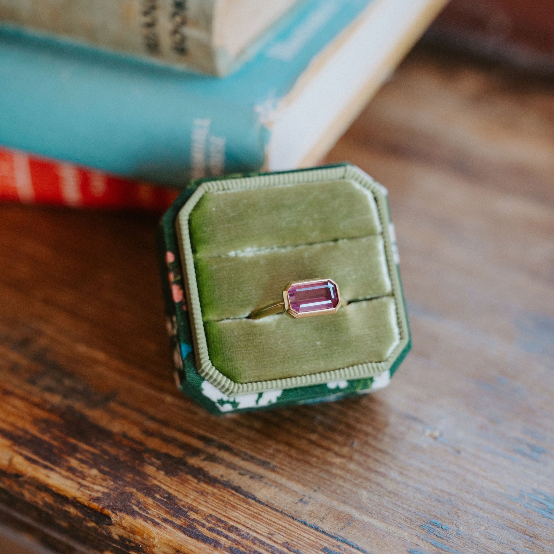 This emerald shaped, step cut beauty measures 9.7 x 5.6mm and weighs 2.50ct. The ring is crafted from 18k gold, the stone is bezel set horizontally (or East-West) and I chose a knife edge band to compliment the angles of the stone.