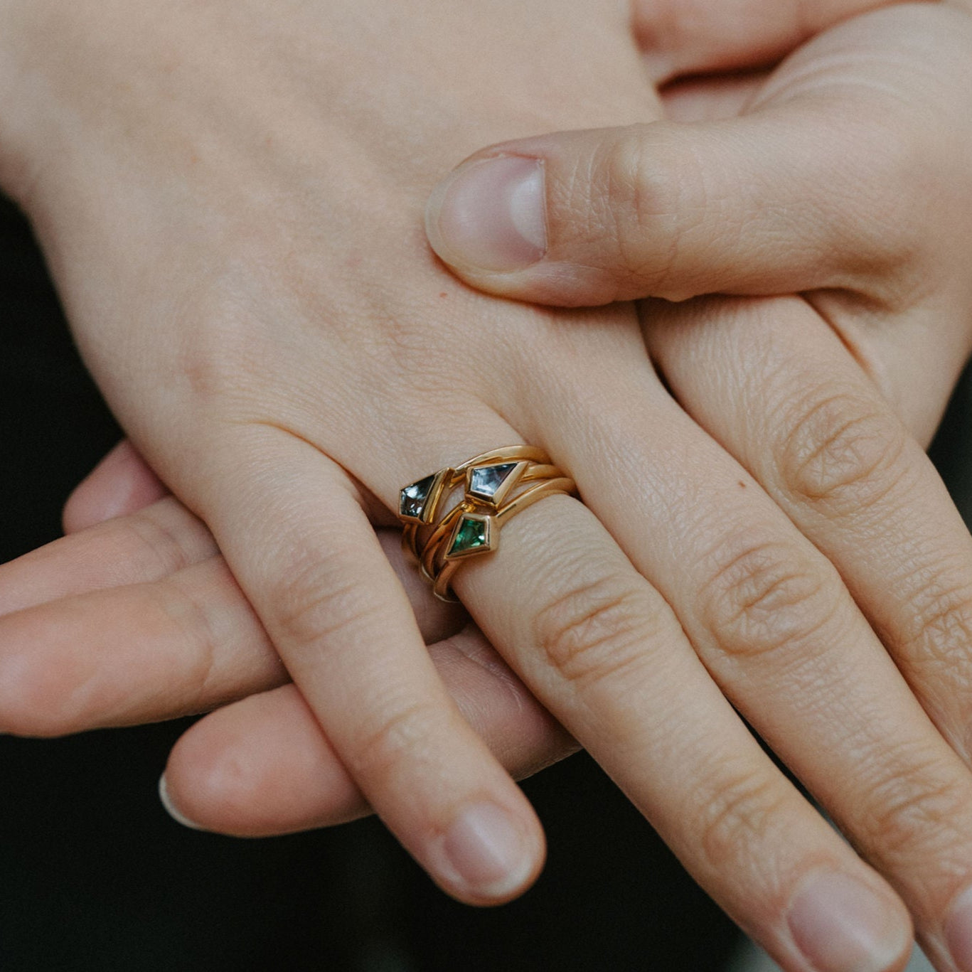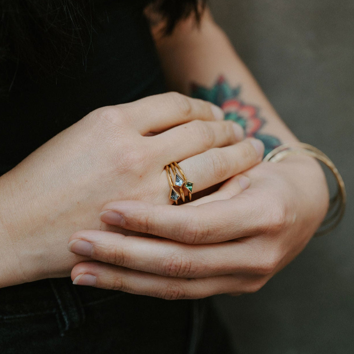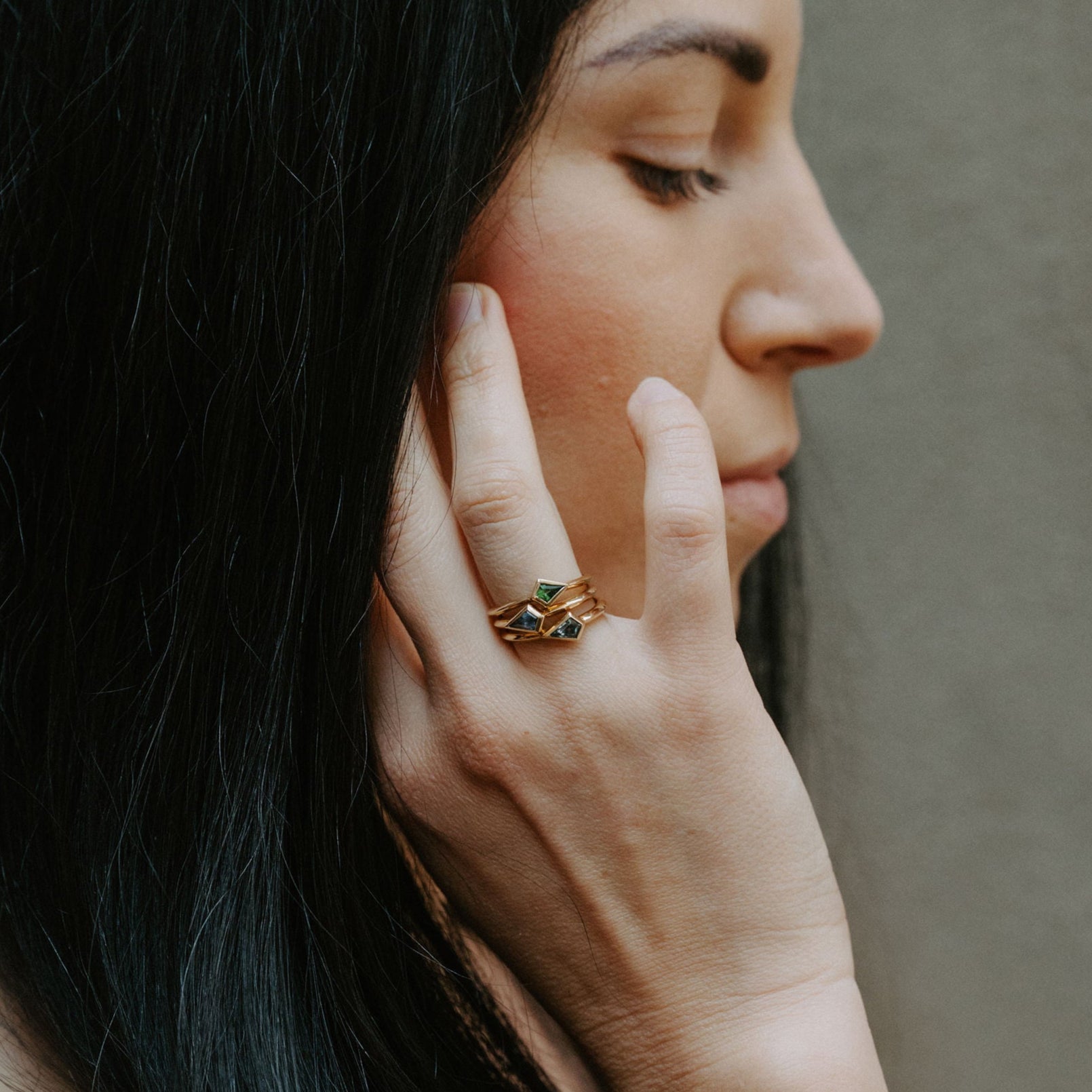 This minimalist ring features a 6x4mm kite shaped blue tourmaline set on a narrow, 14k knife edge band. Looks great stacked together or worn solo.