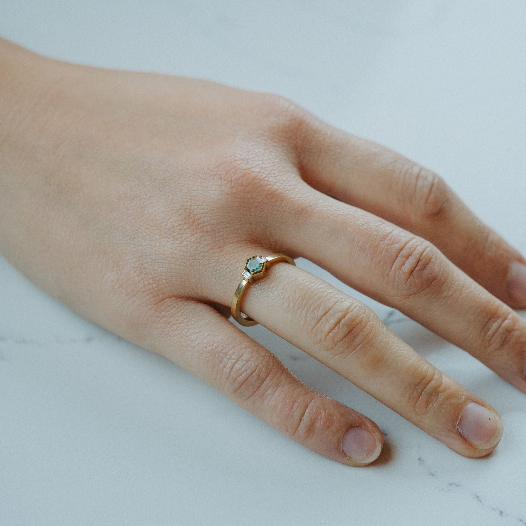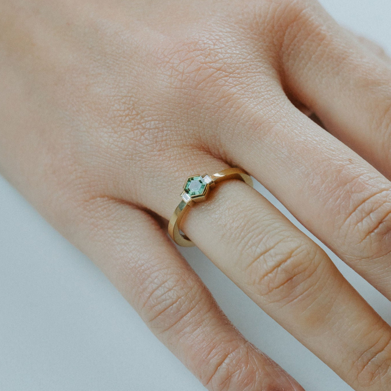 This exquisite 18k yellow gold 3-stone ring features a stunning green hexagonal Nigerian sapphire flanked by two diamond baguettes. Its unique hexagon cut and vibrant color are sure to wow!