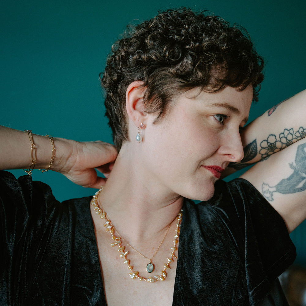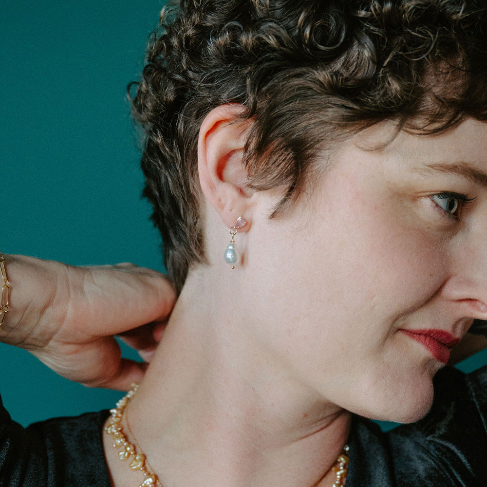 Set in solid 14K gold, these earrings blend artisanal gemstone cutting with the unique beauty of keshi pearls, creating a refined yet modern silhouette perfect for everyday elegance or special occasions.